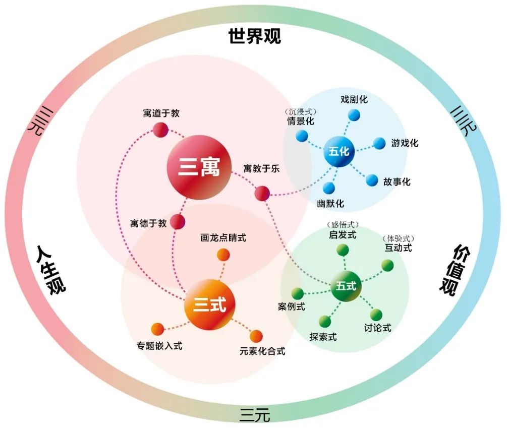 就“三寓三式(五化五式)”知识元而言,“三寓”是指把专业课与思政课知识点进行融合的三种方法,即“寓道于教”、“寓德于教”、“寓教于乐”;“三式”则是指课程思政与专业教学的具体融合手段,即“专题嵌入式”、“画龙点睛式”、“元素化合式”,它们与“寓道于教”、“寓德于教”存在着紧密联系。其中,“寓教于乐”的具体实施手段又囊括了“五化五式”,即:情景化(沉浸式)、戏剧化、游戏化、故事化、幽默化、启发式(感悟式)、互动式(体验式)、讨论式、探索式、案例式等。总体上,“三寓三式(五化五式)”所有知识元的内容,又融会于以“世界观、人生观、价值观”为架构的“三元”体系之中,呈现出“三寓三式(五化五式)”范式与三元体系互融互通、一以贯之的理念。