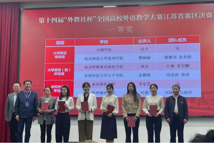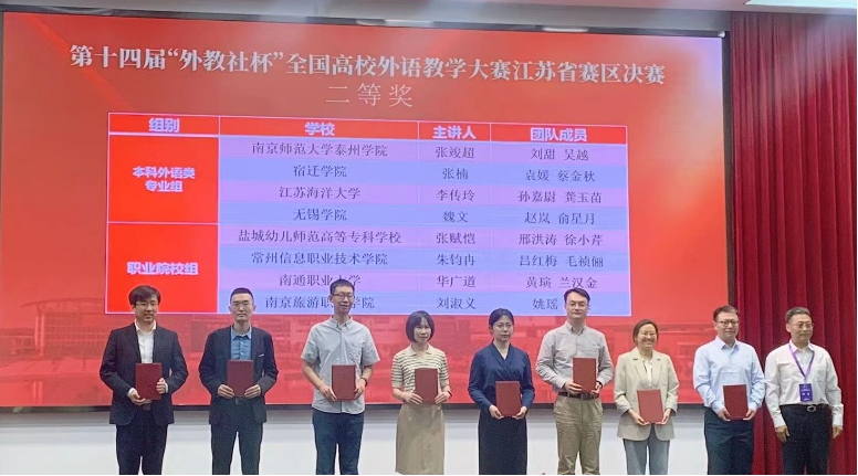 5月13-14日,第十四届“外教社杯”全国高校外语教学大赛江苏省赛区决赛在宿迁学院举行。江苏省赛区比赛设大学英语综合组、大学英语视听说组、本科英语专业组、研究生英语组等,来自东南大学、南京师范大学、南京航空航天大学等院校的95名选手和团队进入了本次决赛,与往年相比呈现出人数明显增多、竞争难度加大的态势。我校人文法政学院副院长赵岚带队,谷丰、魏文两位教师参加了此次决赛。经过激烈角逐,我校教师凭借扎实的专业功底、良好的教学设计能力和出色的课堂教学水平分别获得大学英语综合组一等奖第一名和本科外语类专业组二等奖,取得我校在该项赛事上的历史性突破。