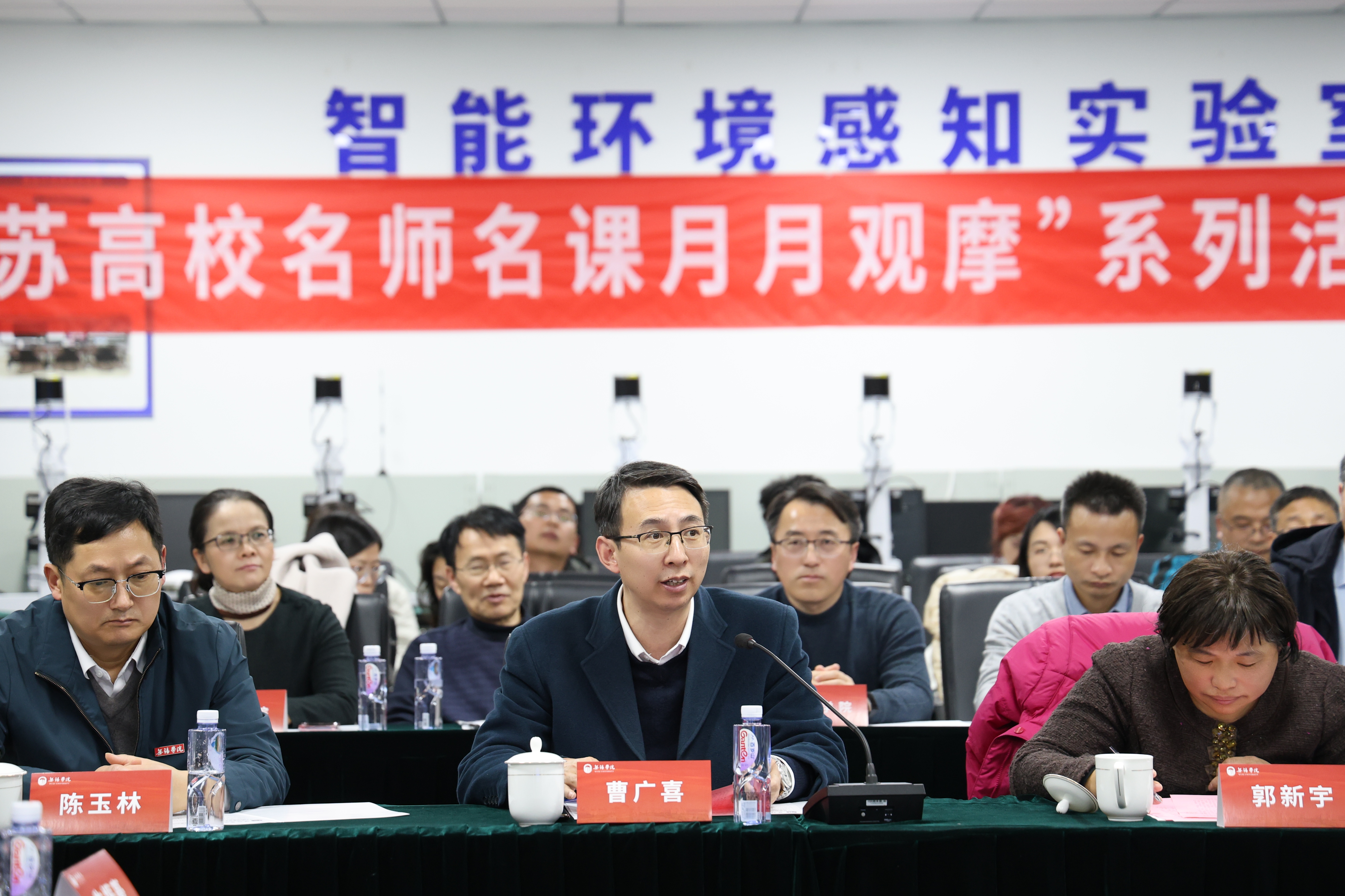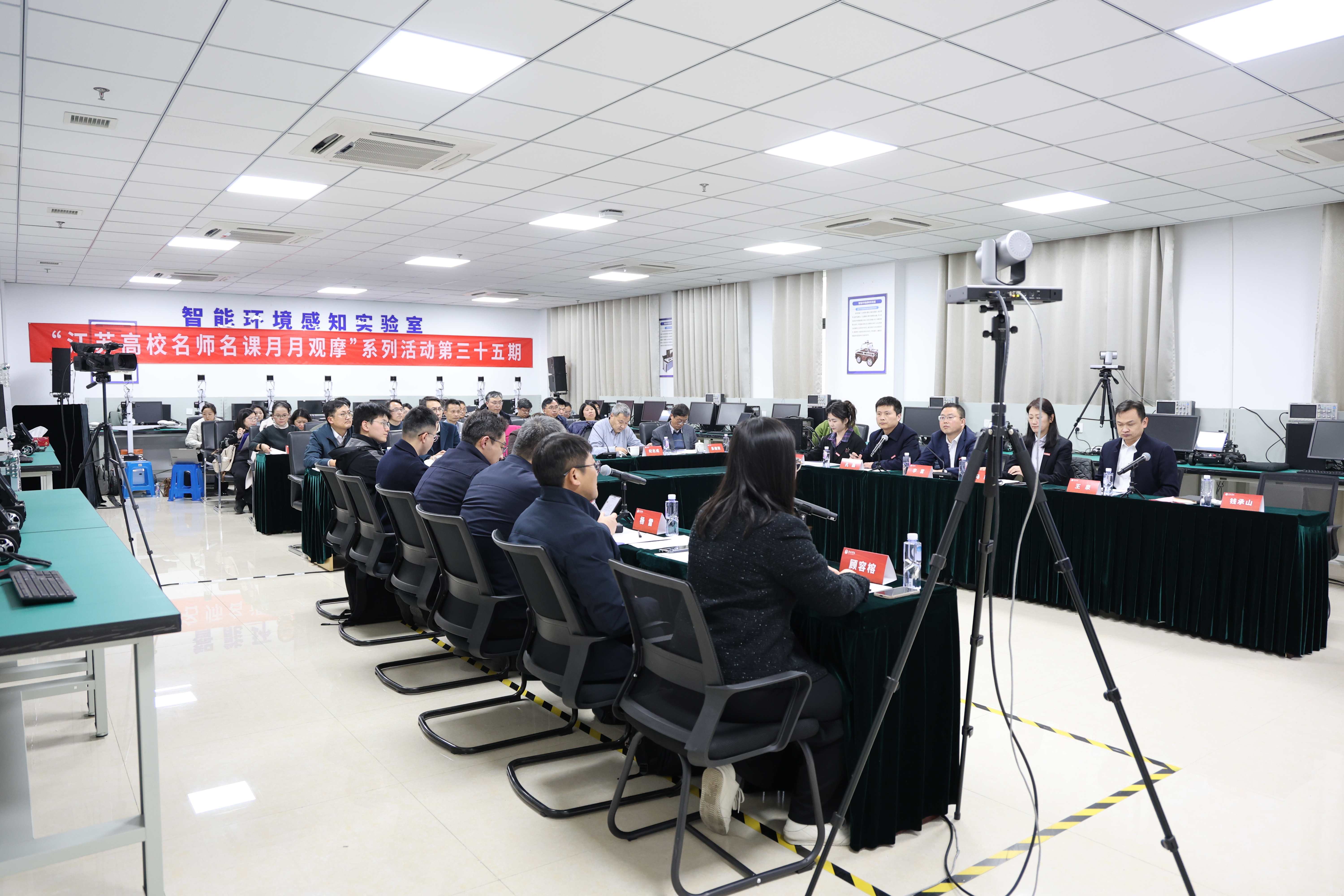 1月16日下午,由江苏高校教师教学发展研究会主办、我校承办的第三十五期“江苏高校名师名课月月观摩”活动在科创楼106智能环境感知实验室举行,并通过“云书院”平台向省内外高校同步在线直播。江苏省教育厅高等教育处二级调研员郭新宇,无锡学院党委常委、副校长曹广喜,江南大学原副校长、国家级教学名师纪志成,江苏天安智联科技股份有限公司董事长杨雷、无锡车联天下智能科技股份有限公司副总裁周哲人、浙江海康智联科技有限公司江苏分公司总经理吴长春,以及中国药科大学、金陵科技学院、泰州学院、太湖学院、南京师范大学泰州学院等高校代表参加活动。本次活动以“校企园联合、产科教融合——车联网产业创新应用型人才培养实践”为主题,由无锡学院教授、江苏省教学名师钱承山主持。