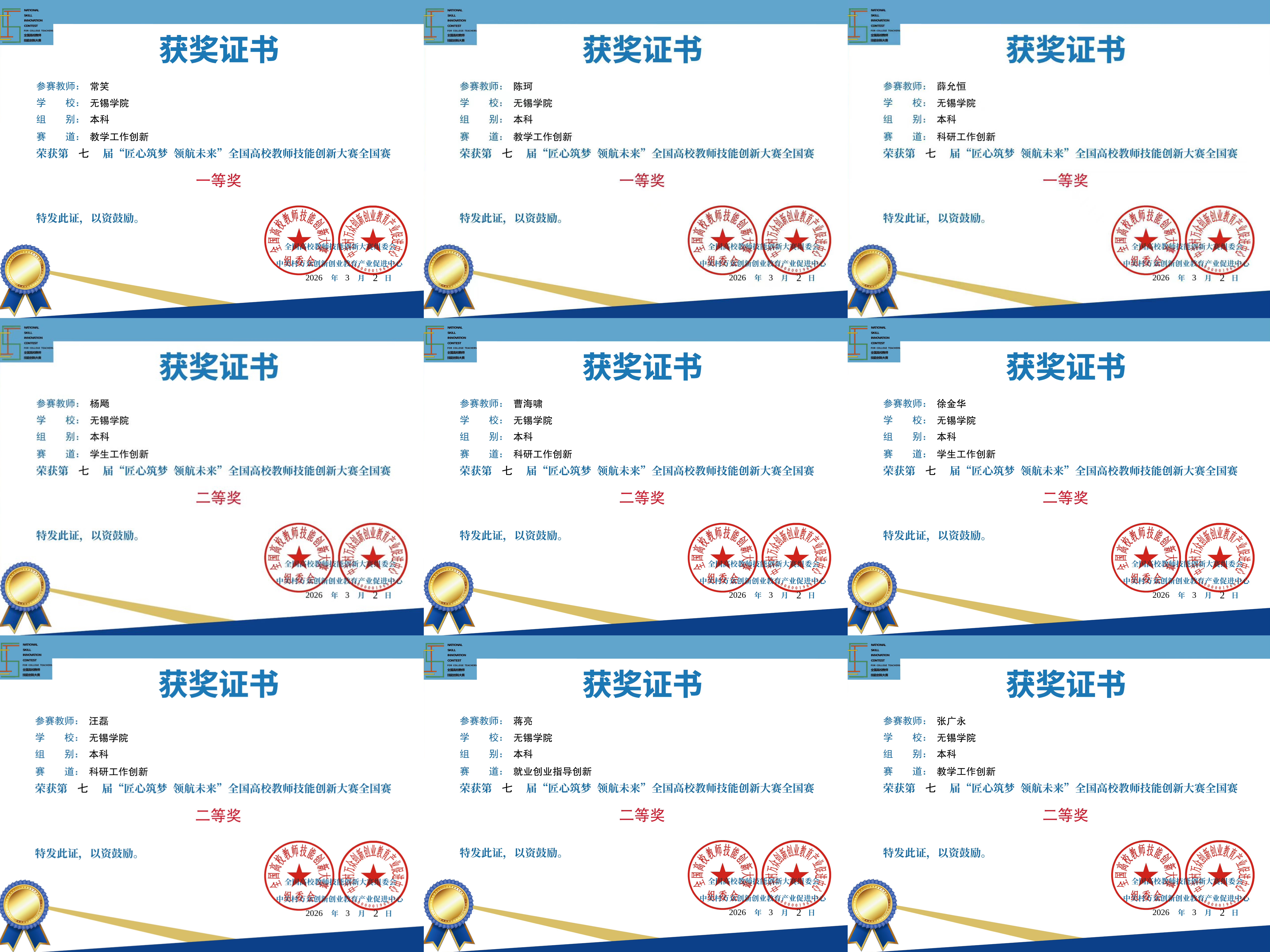 本次大赛已纳入中国高等教育学会高校教师教学竞赛清单,是面向全国本科院校、高职高专院校及技师学院教师,聚焦教学创新、科研创新、学生工作创新、就业创业指导创新四大赛道的重要赛事。我校参赛教师历经校级推荐、全国初赛(在线测试)、复赛(创新成果评审)的多环节遴选,从众多参赛者中脱颖而出。获奖成果展现了我校教师在立德树人根本任务指引下,深耕岗位、锐意创新的扎实功底与专业素养。