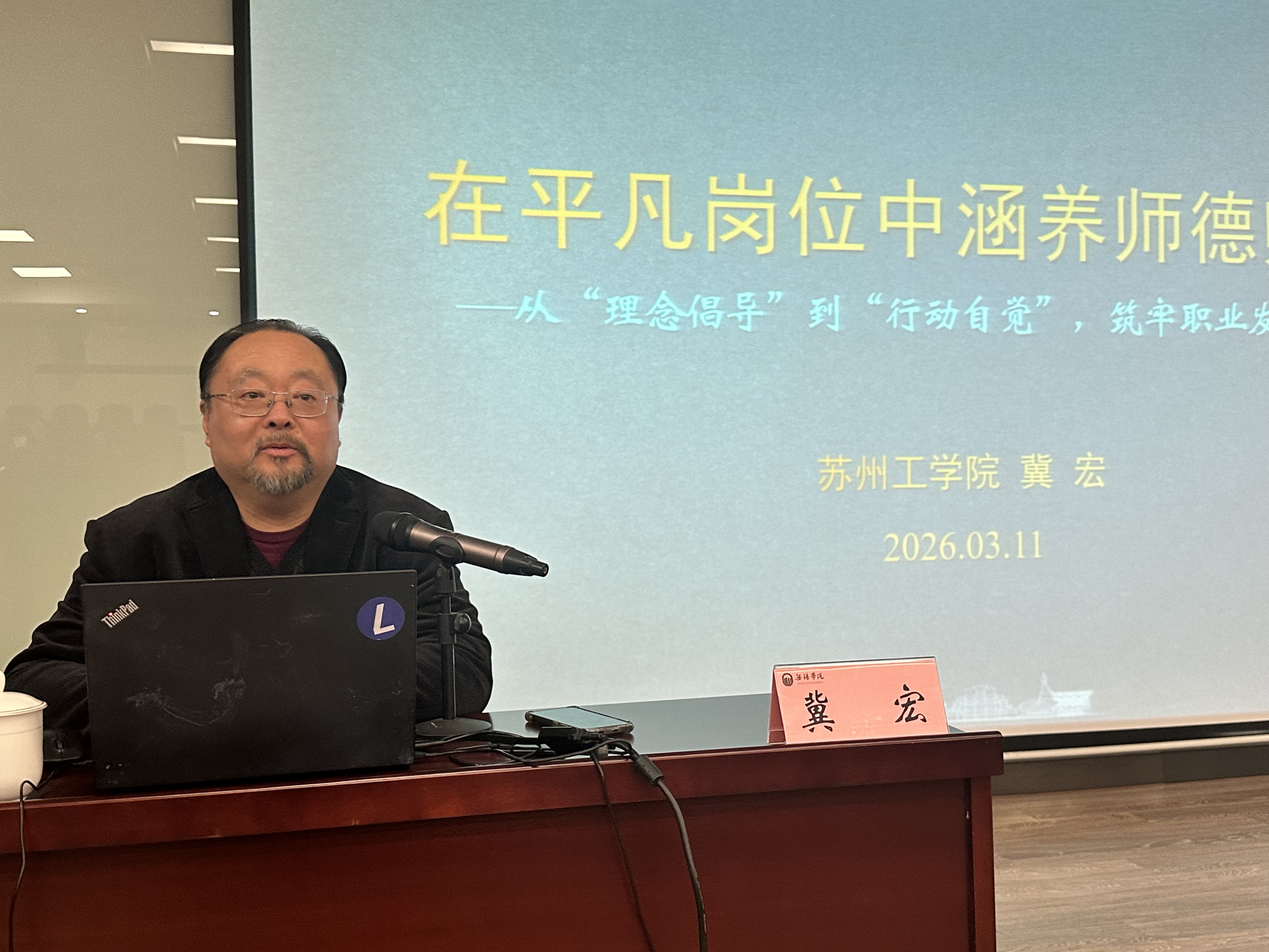 为深化新时代教师队伍建设,助力青年教师筑牢职业发展根基。3月11日,我校在行政楼227成功举办2025-2026学年第二学期新教师培训开班仪式暨新教师培训系列讲座第十七期。本期讲座特邀苏州工学院质量管理与发展处副处长、江苏省教学名师冀宏教授作题为《在平凡岗位中涵养师德师风—从“理念倡导”到“行动自觉”,筑牢职业发展根基》的专题报告。50余名新教师参加,讲座由教师发展与教学评估中心副主任(挂职)汤艺琼主持。