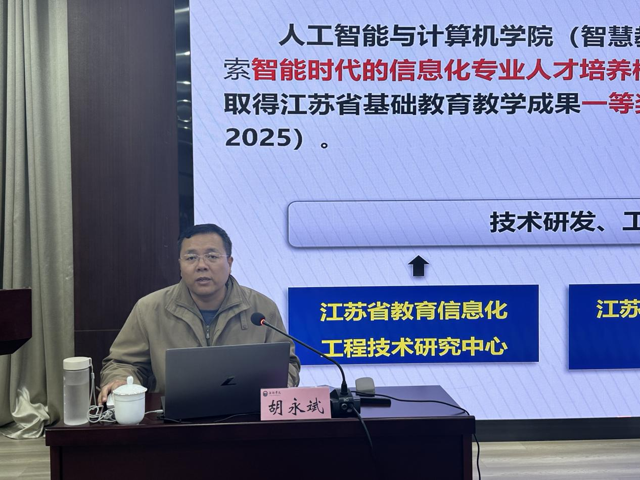 为深入推进教育数字化转型,提升新教师的信息化教学素养与创新能力。11月21日,我校在行政楼121成功举办了新教师培训系列讲座第十六期。本次讲座特邀江苏师范大学人工智能与计算机学院胡永斌副教授作题为《启智赋能,融合创新——生成式AI助力高校教学的技术路径与案例分析》的专题报告。100余名新教师参加,讲座由教师发展与教学评估中心洪羽翔主持。